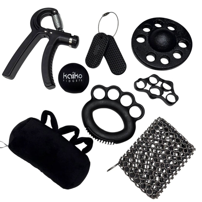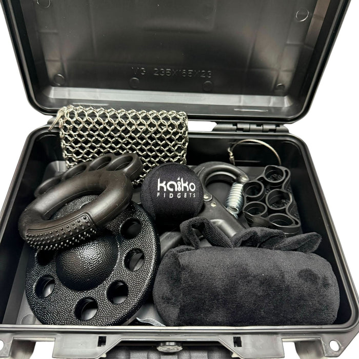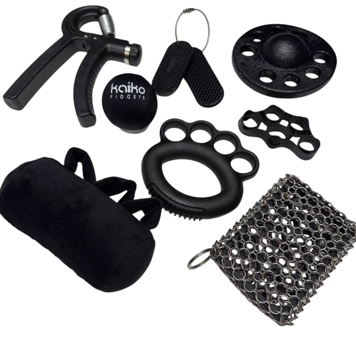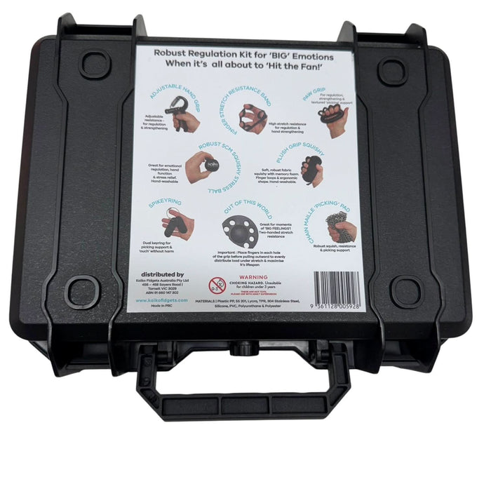 An amazing kit to grab and go which includes 8 different regulation tools to support anywhere. Provides 'heavy work', 'safe' ouch & movement which assists in regulating. Also great for hand function.